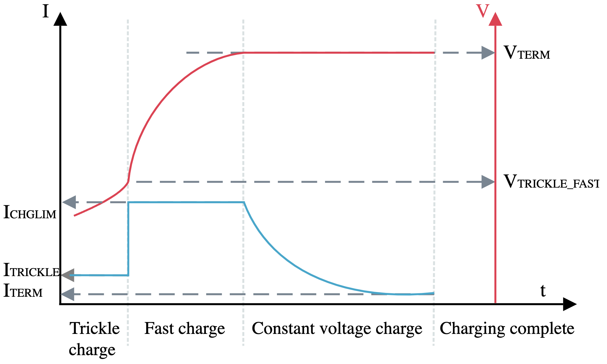 If voltage close to \(V_{TERM}\) and current is close to \(I_{TERM}\), then charging complete