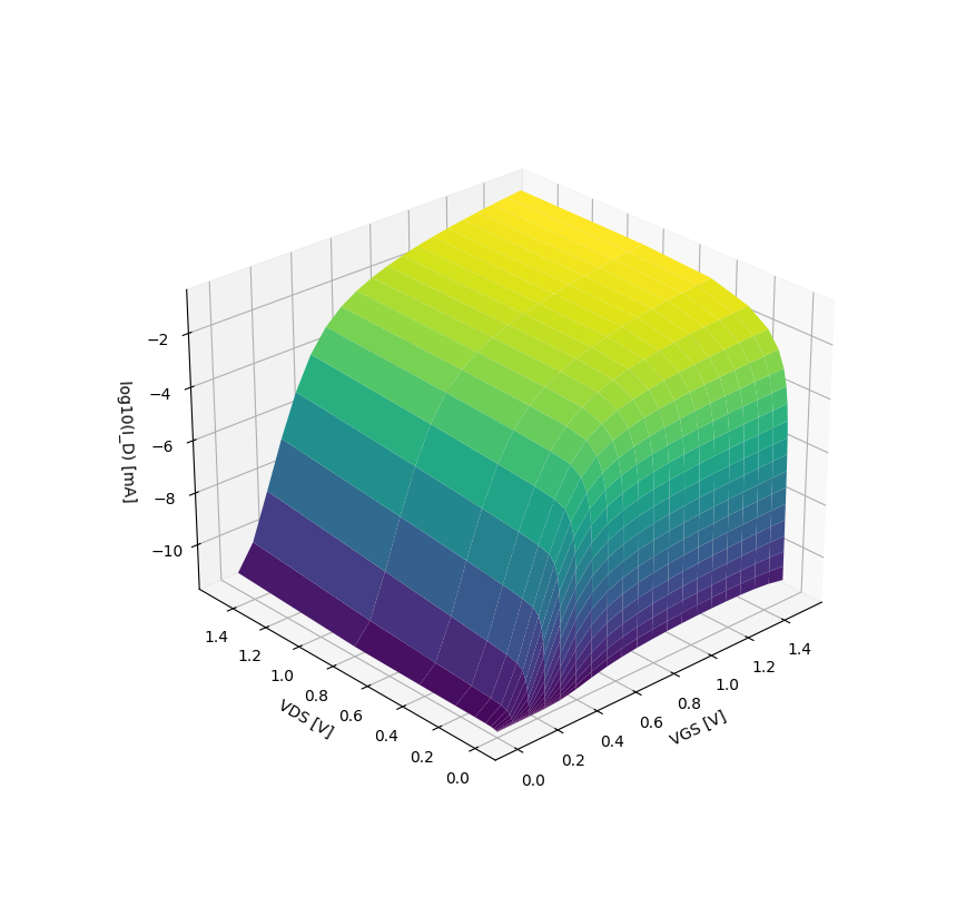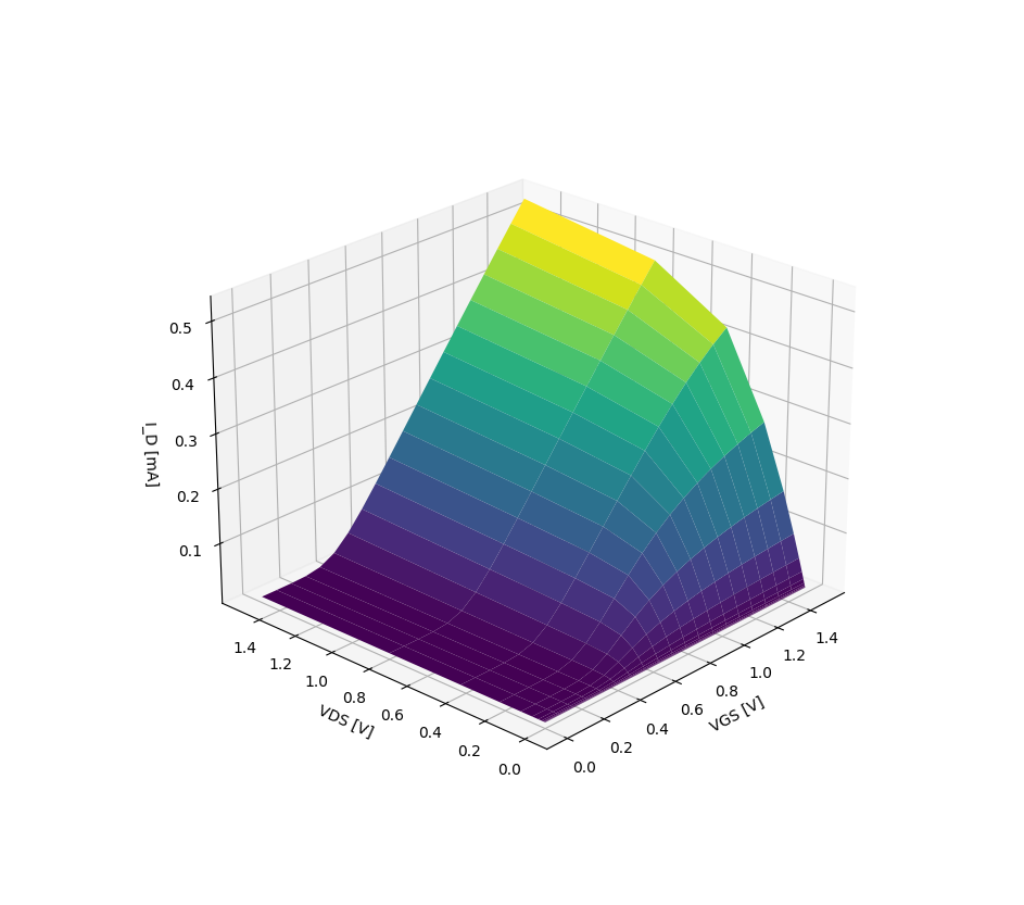 NMOS current (W = 0.4u L=0.15u) as a function of \(V_{GS}\) and \(V_{DS}\)