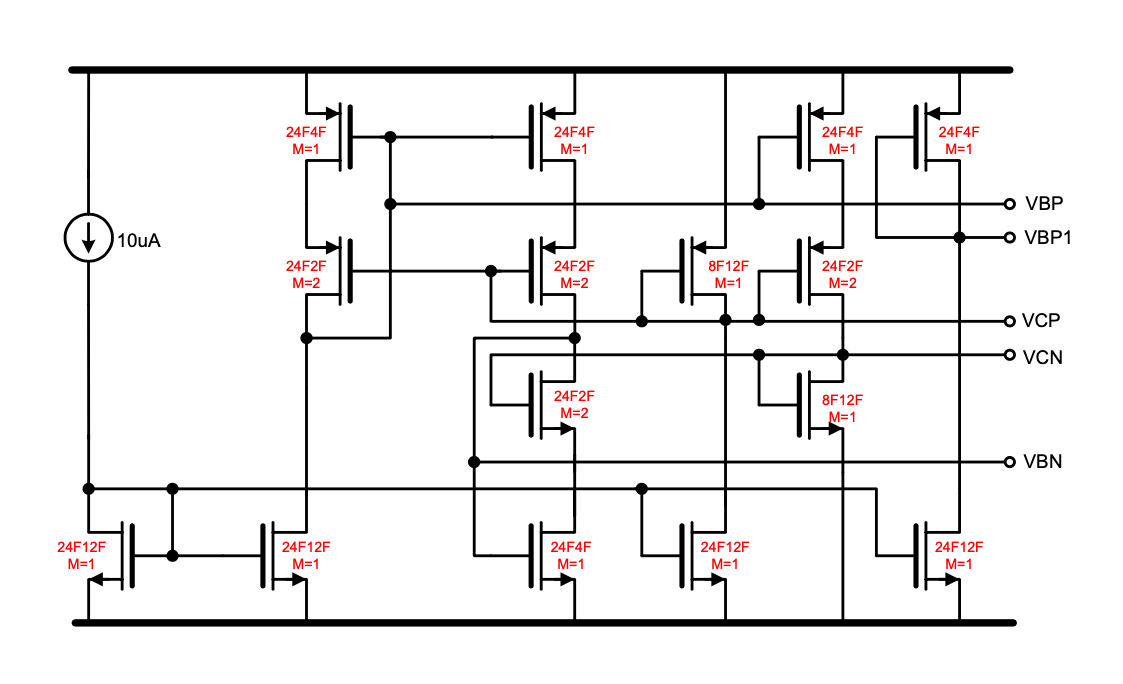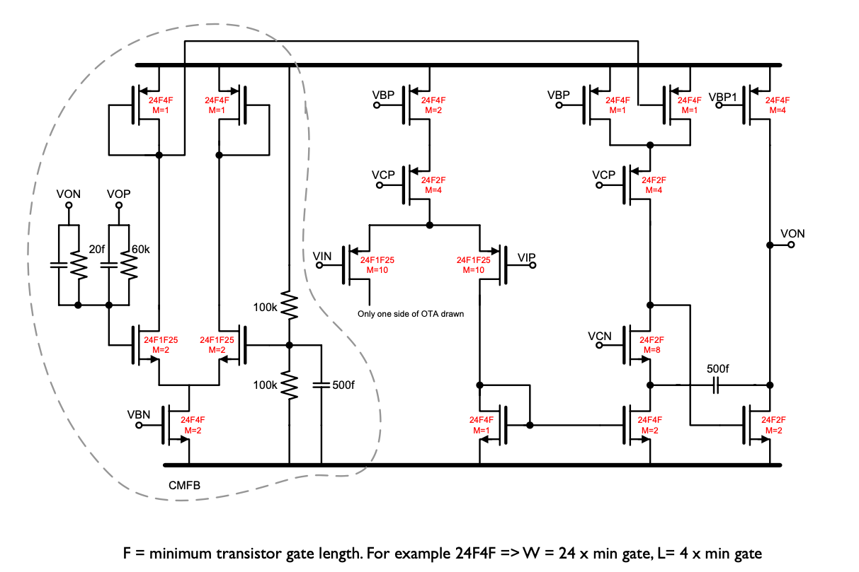 Below is a fully-differential two-stage OTA that will work with most SC circuits. The notation “24F1F25” means “the width is 24 F” and “length is 1.25 F”, where “F” is the minimum gate length in that technology.