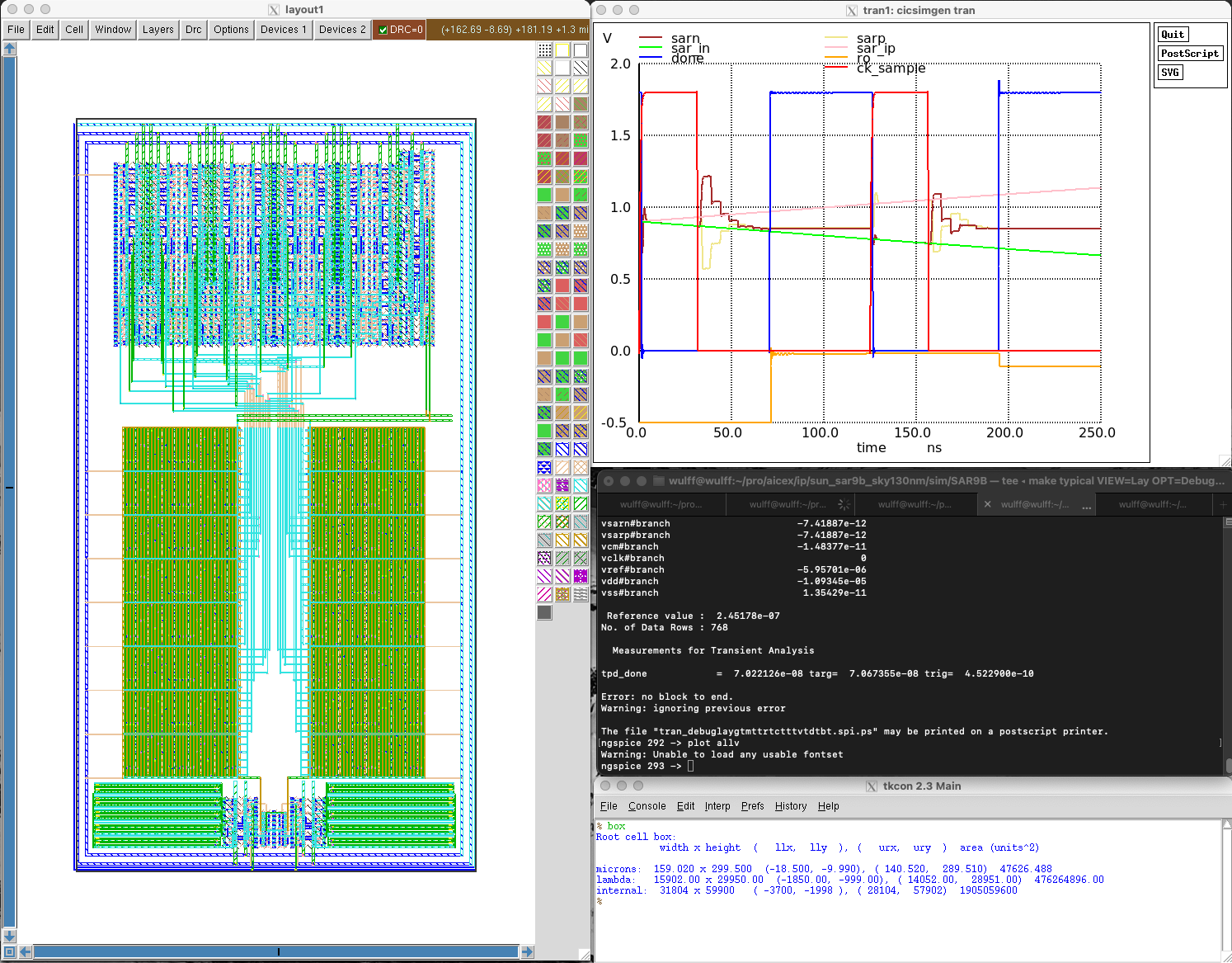 The switch I used in my JSSC SAR is a fully differential boostrapped switch with cross coupled dummy transistors. The JSSC SAR I’ve also ported to GF130NM, as shown below. The switch is at the bottom.