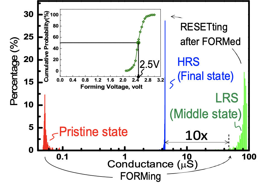 Below is an example of ReRAM. In the Pristine state the conductance is low, resistance is in the hundreds of mega Ohm. In a transistor we want the oxide to stay high resistive. In ReRAM, however, we apply a high voltage across the oxide, which forms a conductive channel across the oxide. Turns out, that the conductive channel can be flipped back and forth between a high resistive state, and a low resistive state to store a 1 or a 0 in a non-volatile manner.