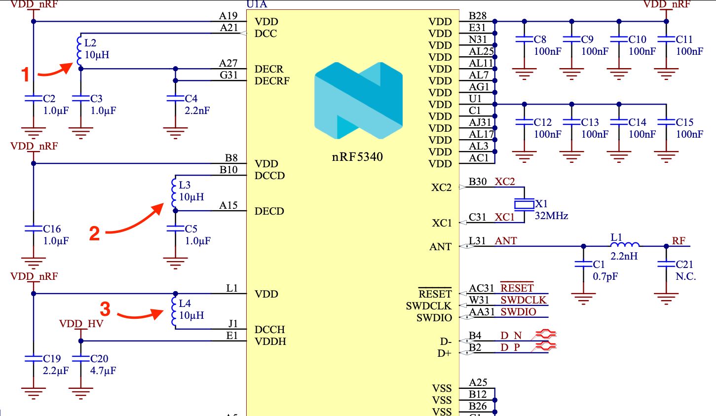 We can see 3 inductor/capacitor pairs. One for the “VDDH”, and two for “DECRF” and “DECD”, as such, we can make a good guess there are three DC/DC converters inside the nRF5340.