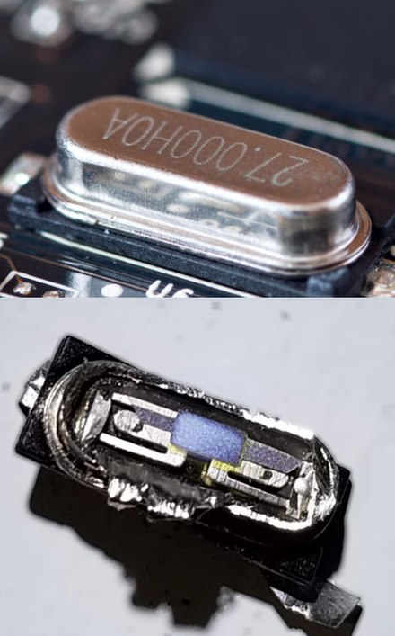A quartz crystal can resonate at specific frequencies. If we apply a electric field across a crystal, we will induce a vibration in the crystal, which can again affect the electric field. For some history, see Crystal Oscillators