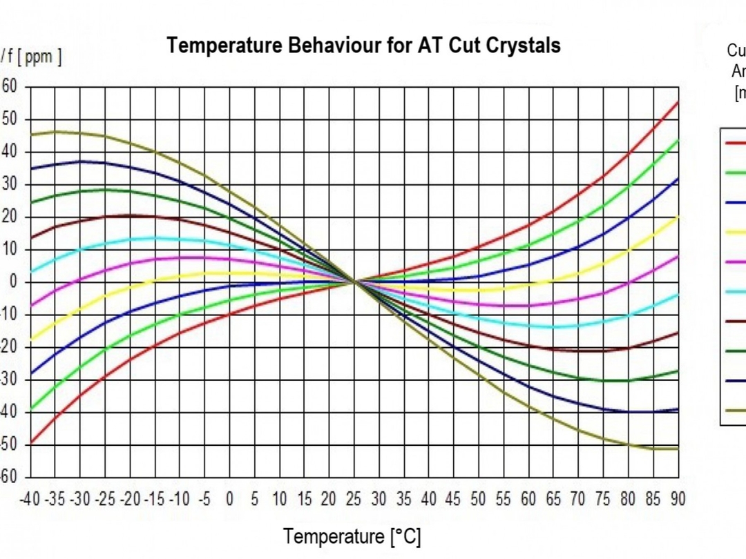 One of the key reasons for using crystals is their stability over temperature. Below is a plot of a typical temperature behavior. The cutting angle of the crystal affect the temperature behavior, as such, the closer crystals are to “no change in frequency over temperature”, the more expensive they become.