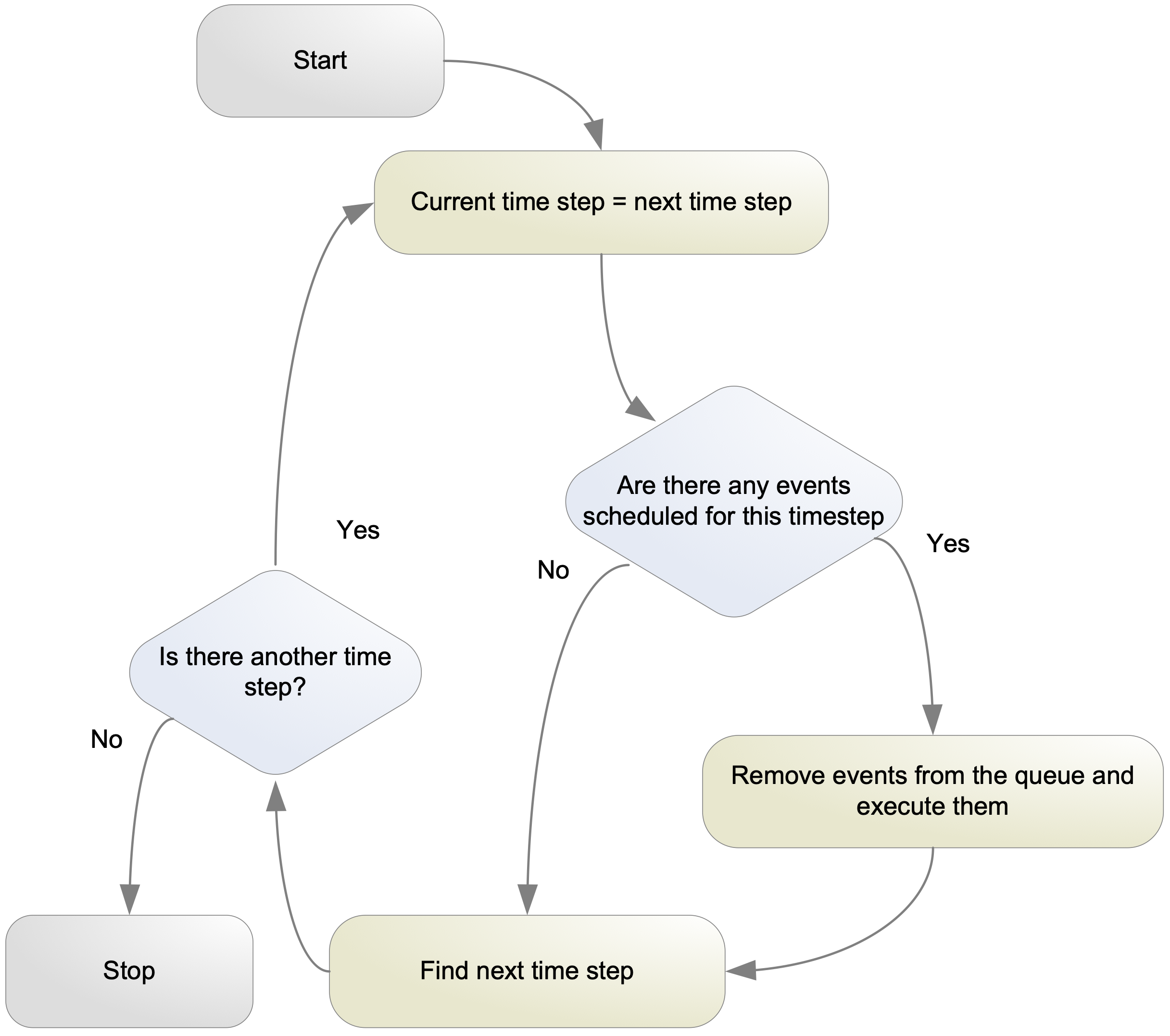 In a digital simulator there will be an event queue, see below. From start, set the current time step equals to the next time step. Check if there are any events scheduled for the time step. Assume that execution of events will add new time steps. Check if there is another time step, and repeat.