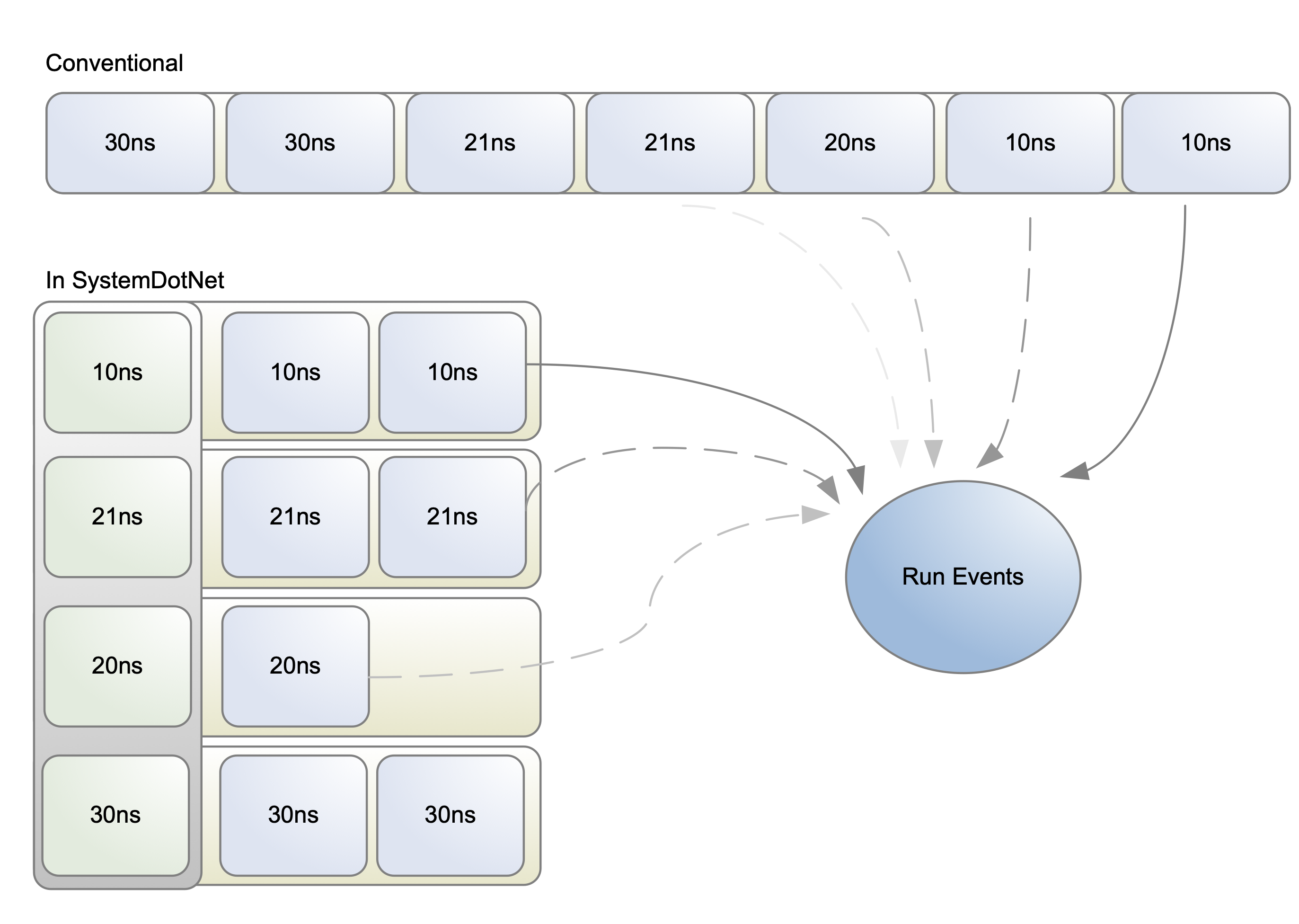 In SystemDotNet I implemented the event queue as a hash table, so it ran a bit faster. See below.
