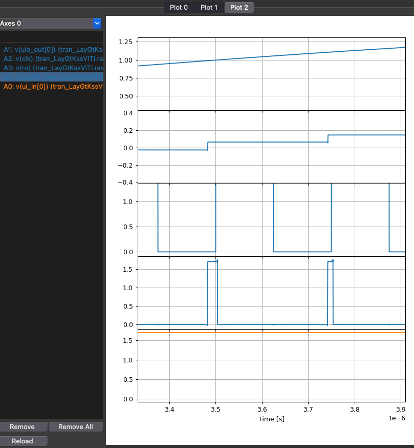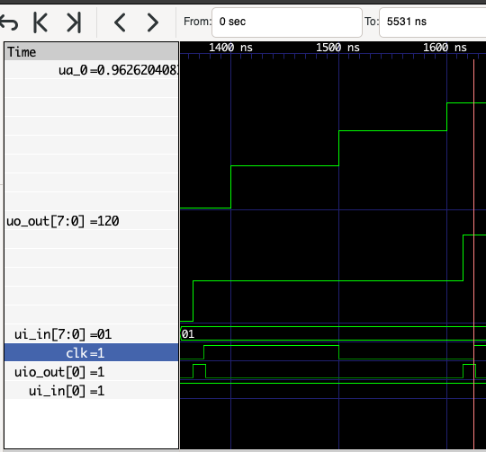 - Digital output (ro) changes when uio_out[0] goes high