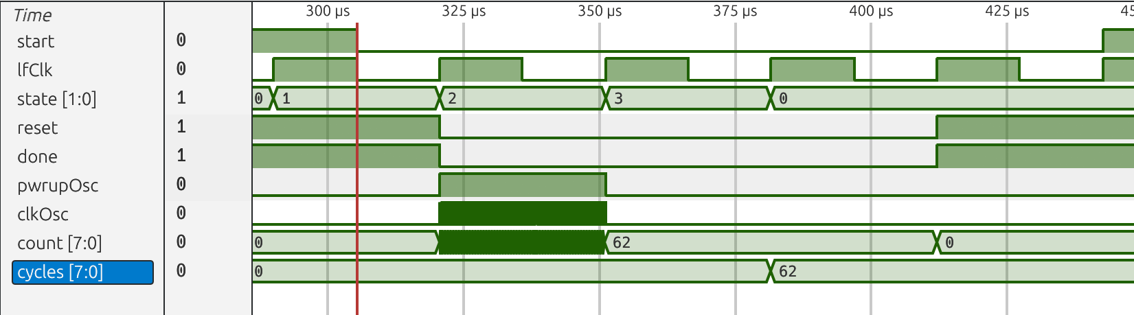 A waveform of the sequence can be seen in Figure 2. When the signal start is asserted the FSM transitions to power up the oscillator (pwrupOsc=1), and we can notice the clkOsc counts the clock pulses of the oscillator. On the next lfClk the oscillator is shut down and the counter naturally stops. The value from the oscillator is stored in the cycles register.