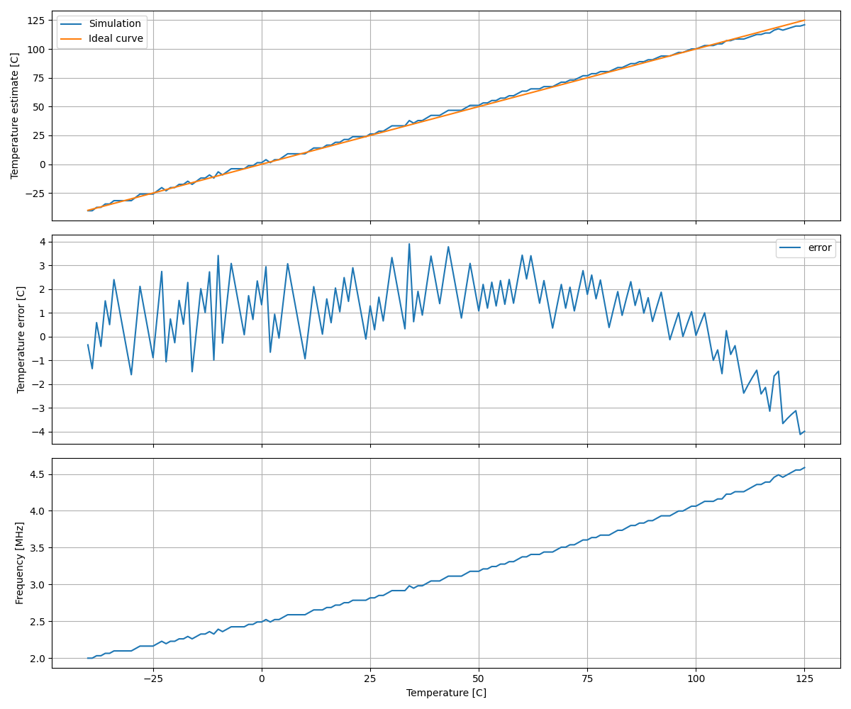 I use a physical model of the oscillator (LELO_TEMP.py) to create a function to turn the frequency back to a temperature. It can be seen that the frequency has a non-zero second order derivative, and thus, the shape of the curve needs to be compensated for. See the python model for details.